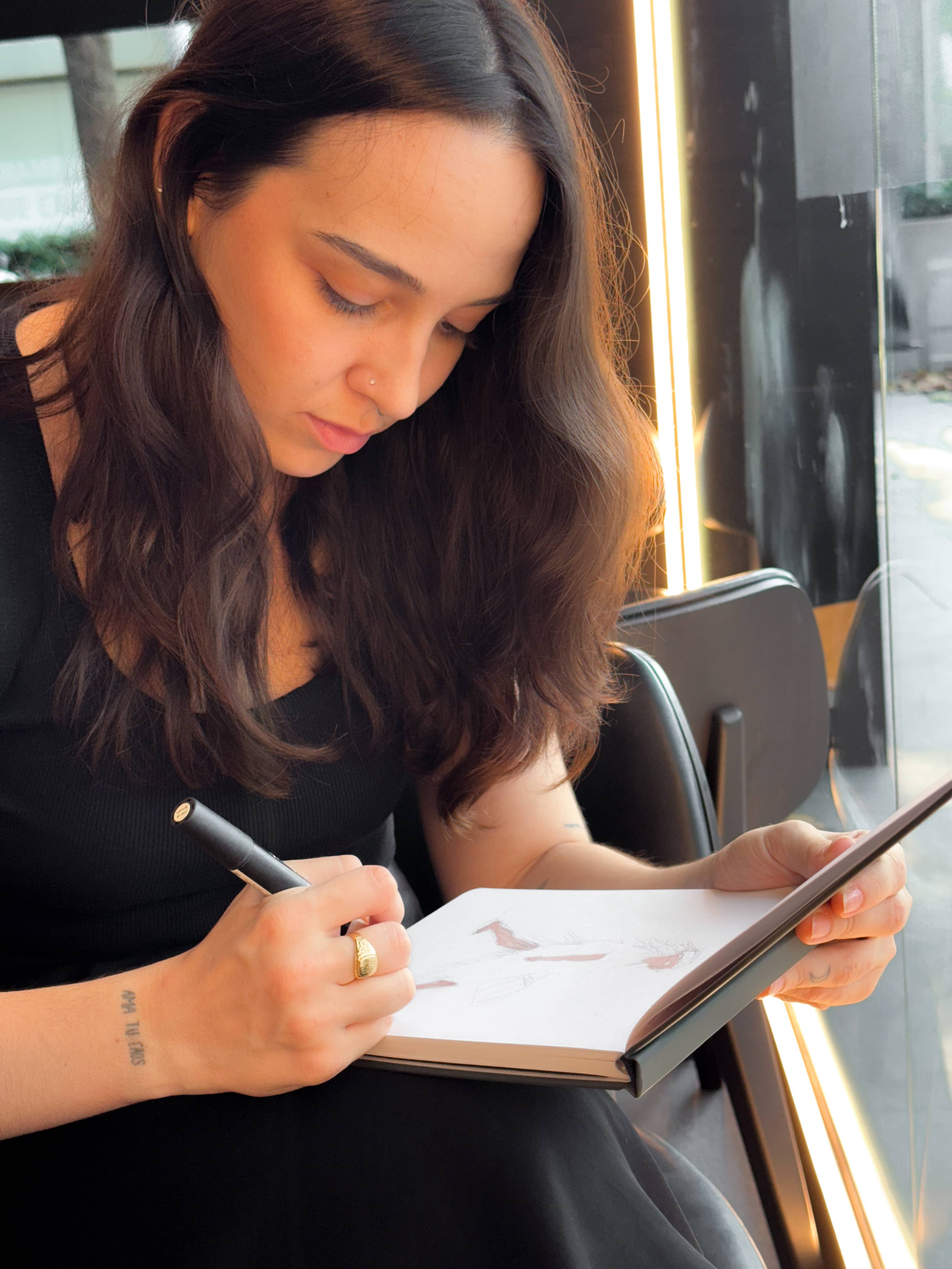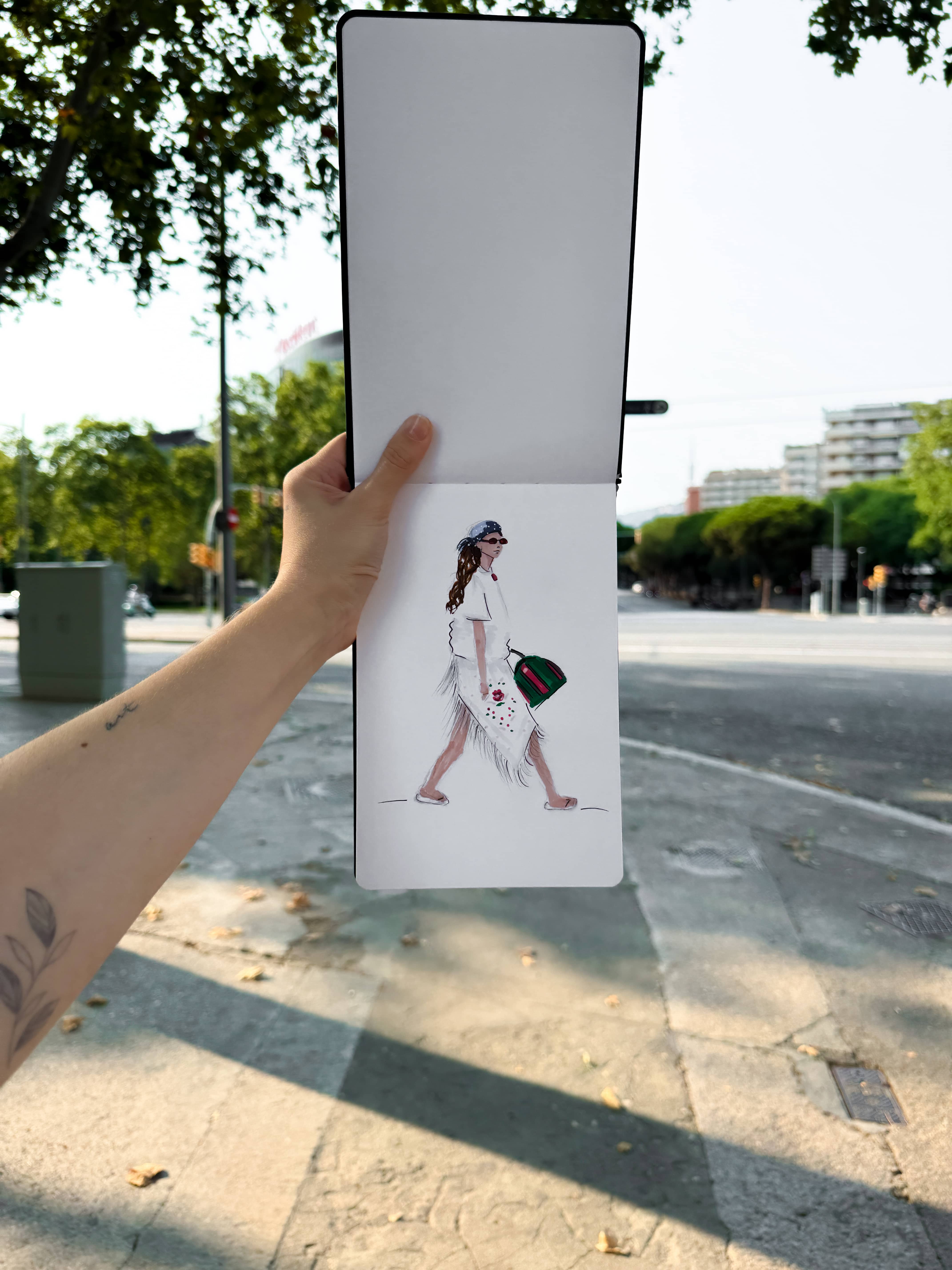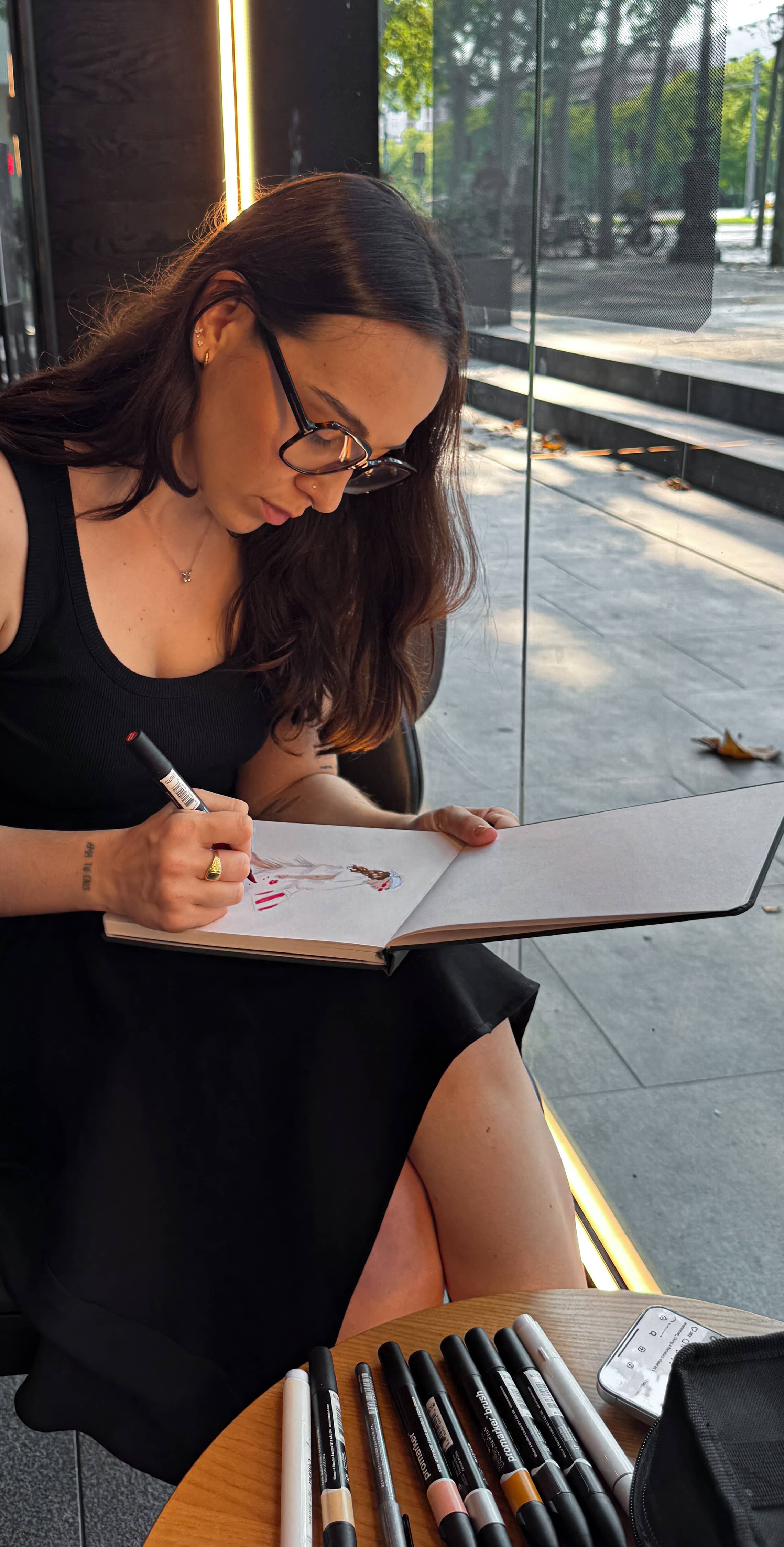 Trabajo principalmente en Barcelona pero me desplazo donde me necesiten. Uso técnica tradicional con materiales profesionales: rotuladores y lápices de alta gama sobre papel Bristol.