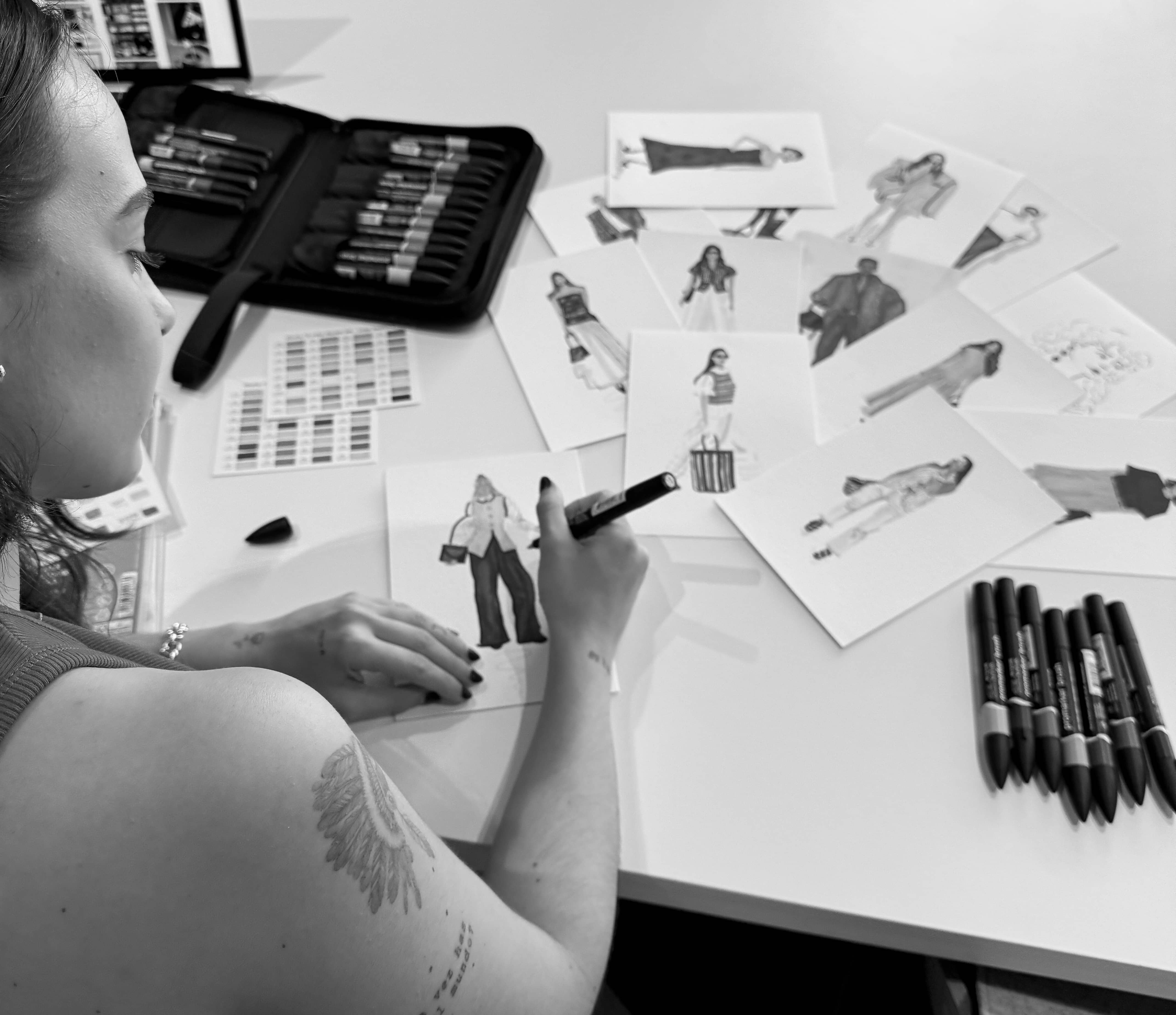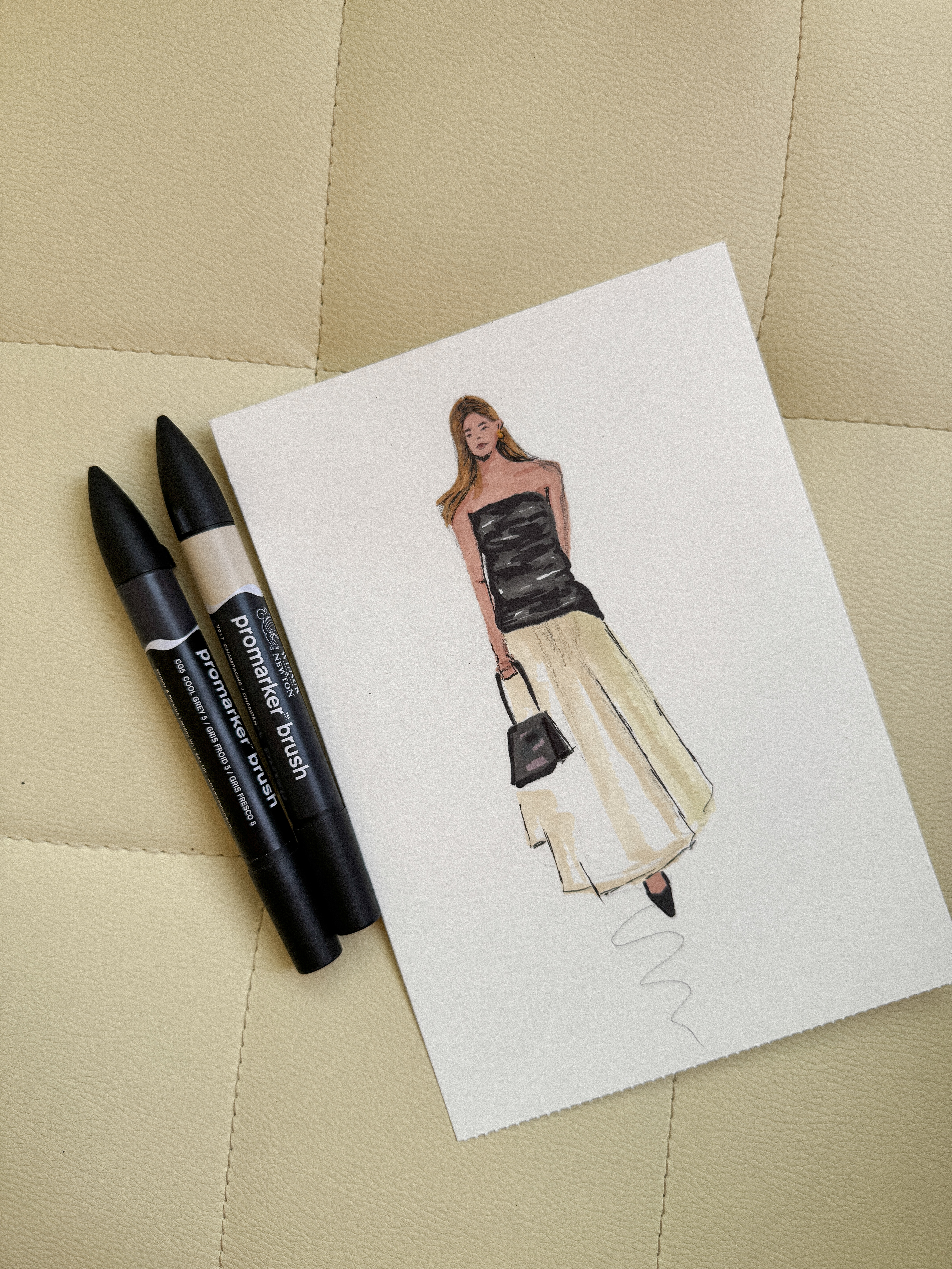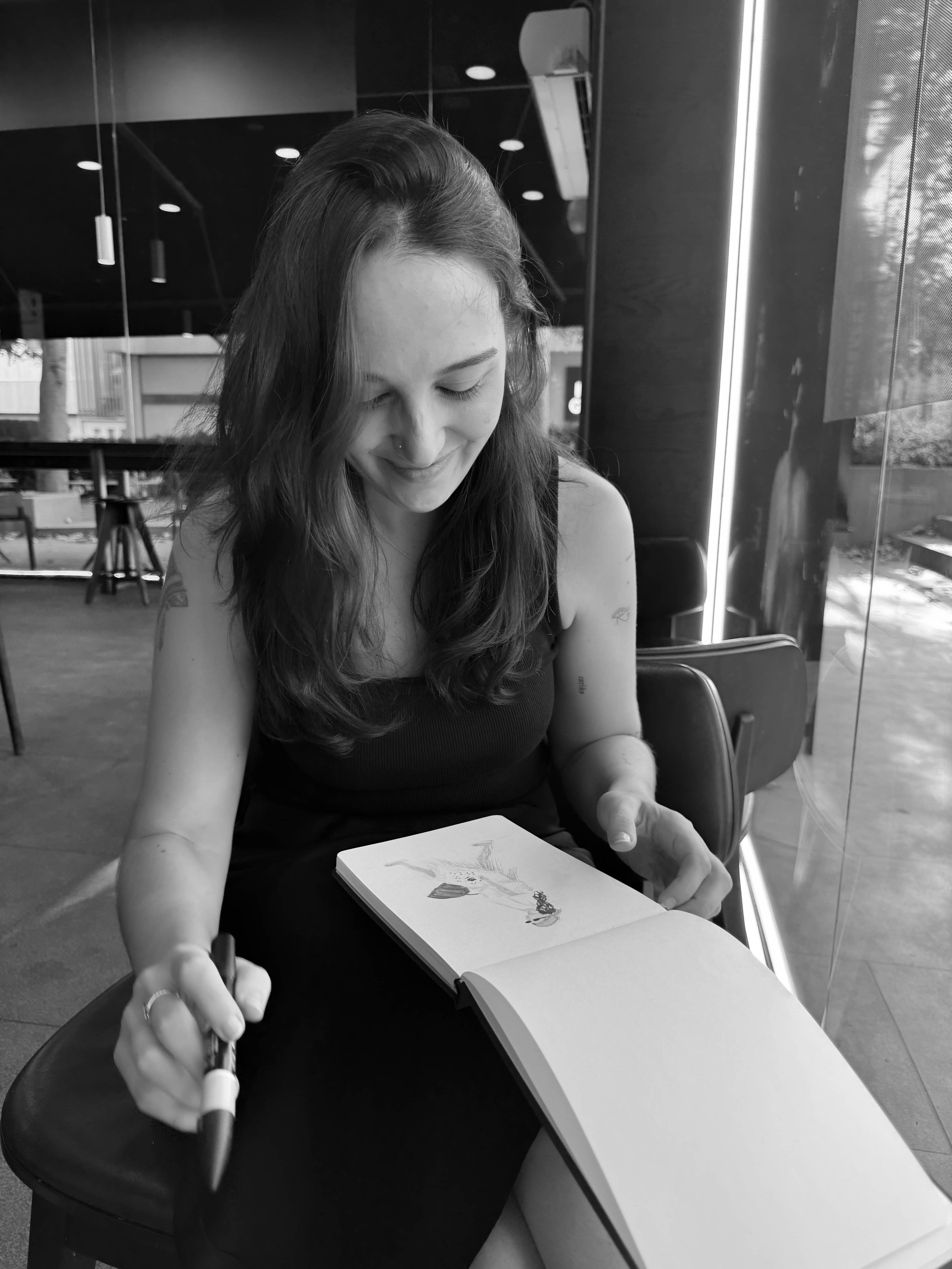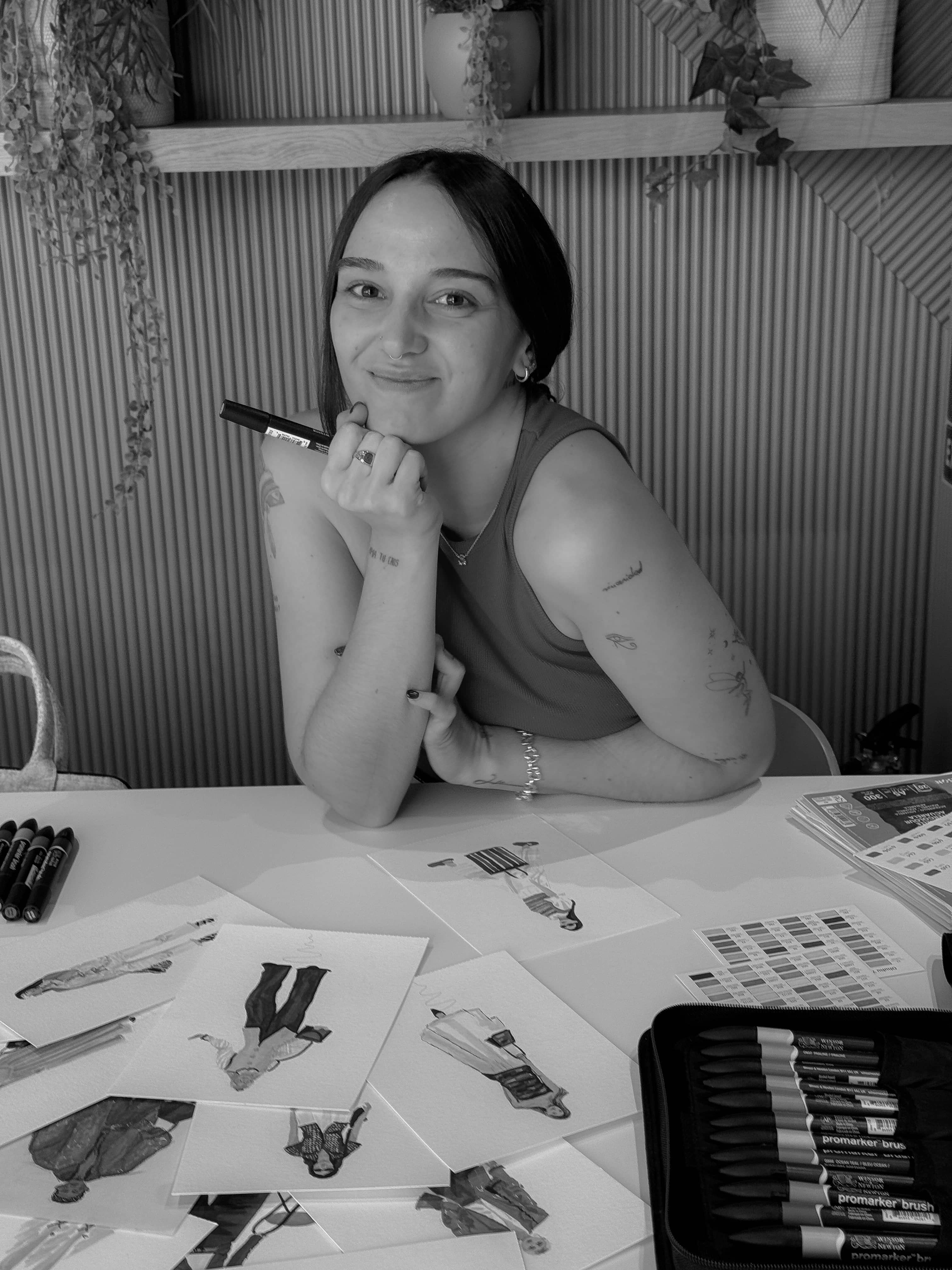 Trabajo principalmente en Barcelona pero me desplazo donde me necesiten. Uso técnica tradicional con materiales profesionales: rotuladores y lápices de alta gama sobre papel Bristol.